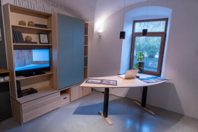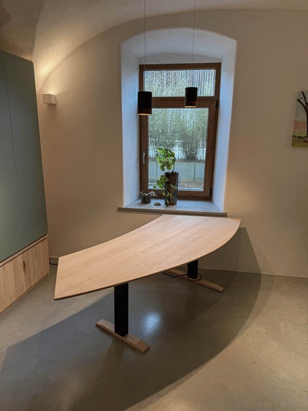 Ergonomisches Arbeiten mit elektrisch höhenverstellbarem Schreibtischgestell. Schreibtischplatte und Fuß aus massiver Birke, weiß pigmentiert geölt.