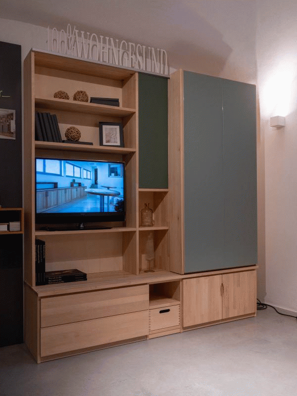 Wohnwand mit 1 Schieberegal, Birke massiv, weiß pigmentiert geölt